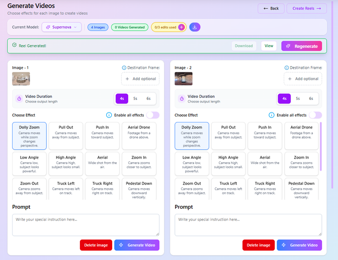 Once your photos are generated, you will be taken to the Generate Videos screen where you can: